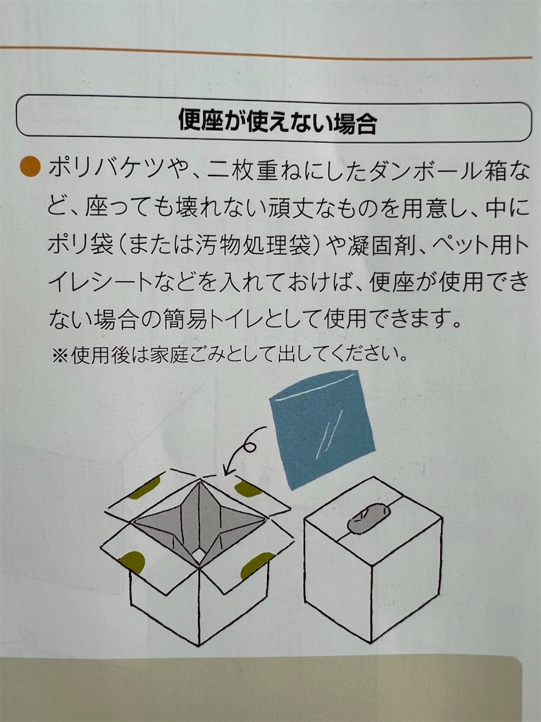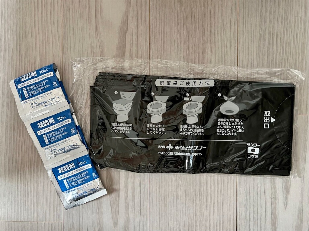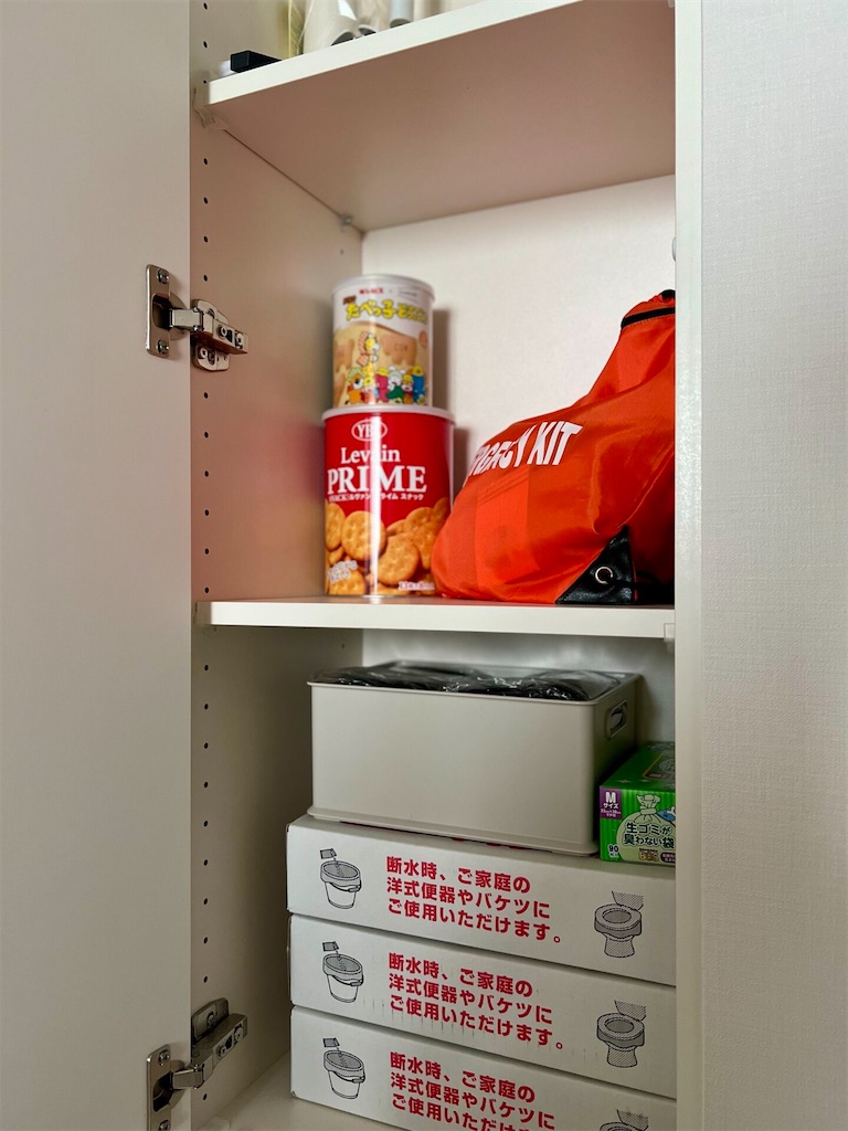 備蓄品は収納の下2段を使用していますが、うち1段は防災用トイレが占めています。