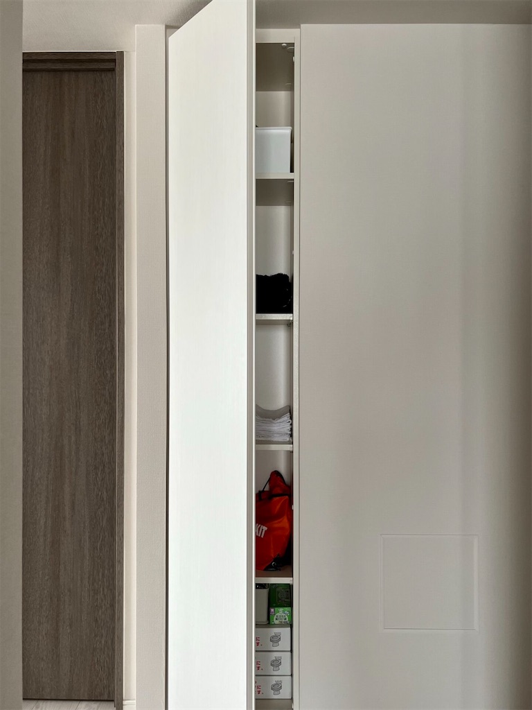 わが家では防災関連のものは廊下収納にて保管しているのですが、玄関・トイレ・LD、どこからでもちょうど良い位置にあって便利だろうと考えてこのスペースにしてみました。