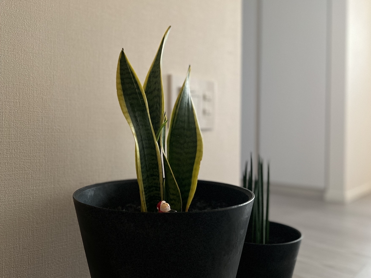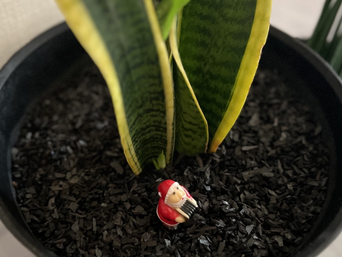 プランターに挿しているサンタクロースを撮ろうと近づいてみたら新芽を発見。