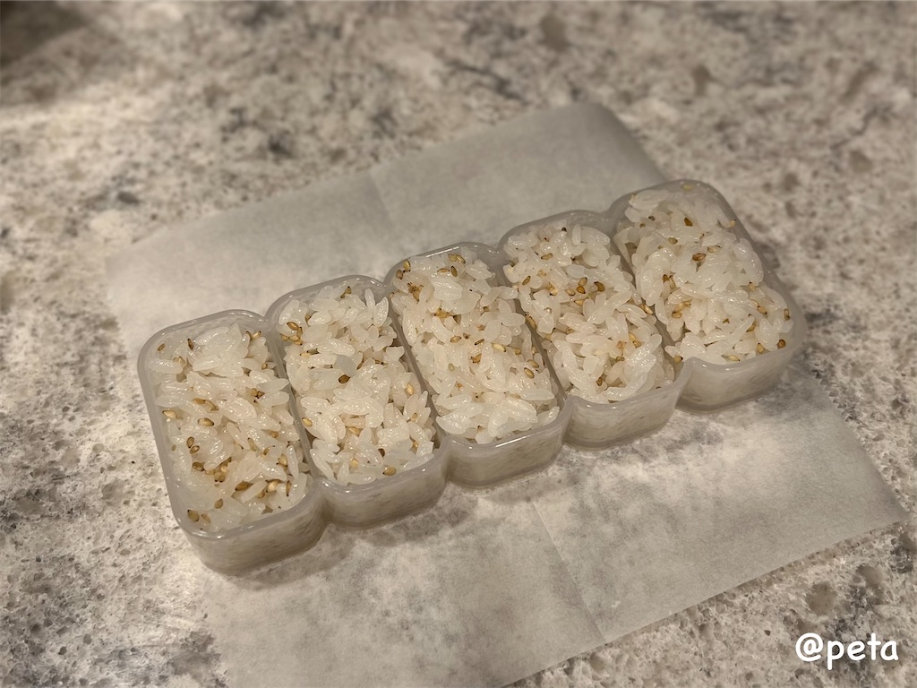 これがまあ便利!ご飯を5つ同時に型に詰めたら、ひっくり返して出来上がりです。
