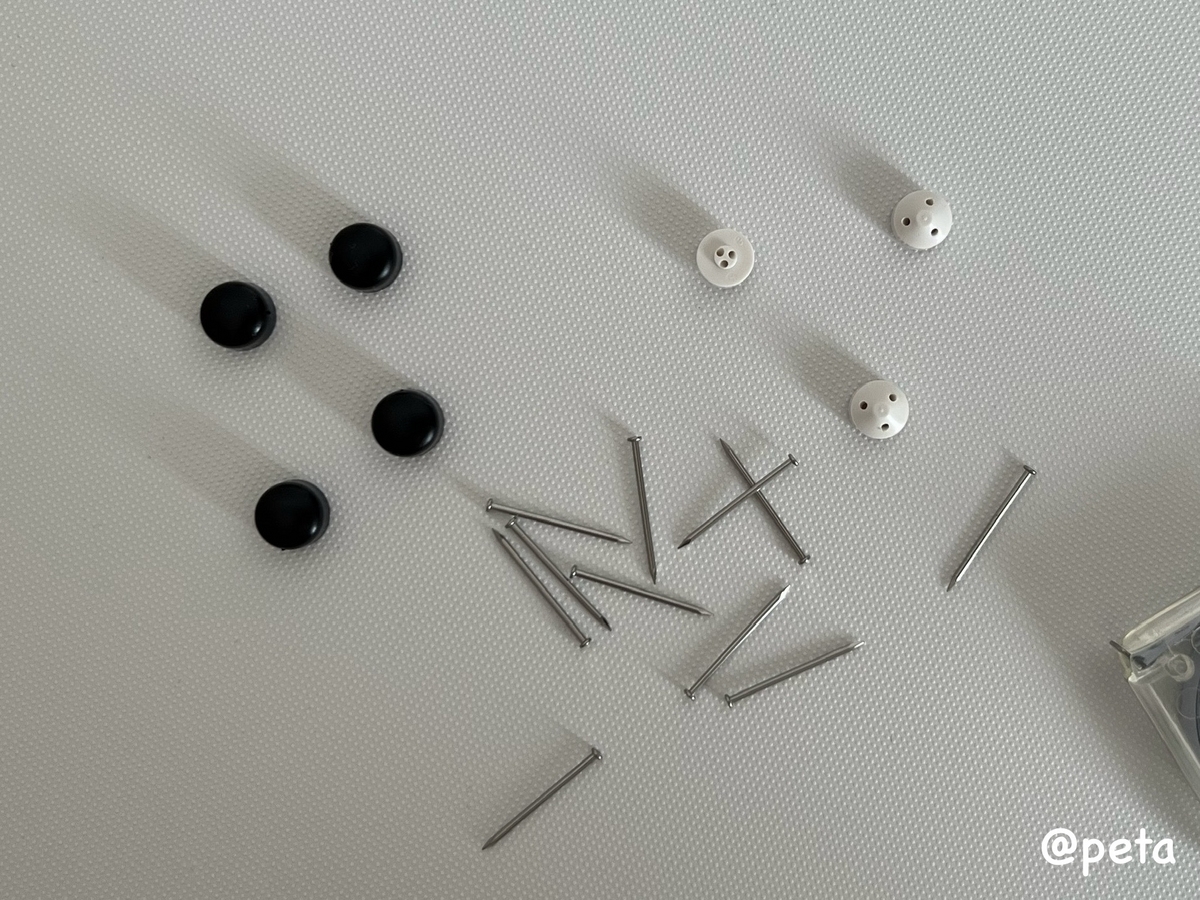 ネジで取り付ける、または穴が目立たないようにピンを打つ2パターンのセットが付属していますが、移動する可能性を踏まえてピンを使用して取り付けました。