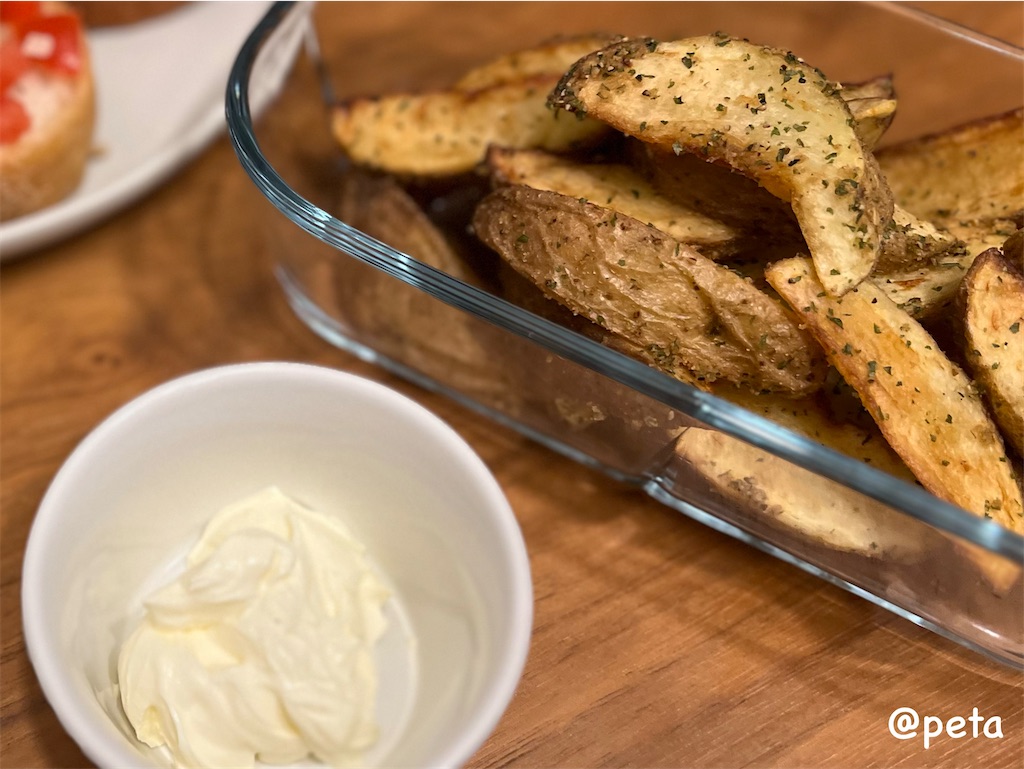 もう10年以上前になりますが、バルト三国を旅したときにお祭りやレストランで必ず付いてきたのがコンソメ味のフライドポテト+サワークリームで、以来時々真似て家で出すようになったというわけです。