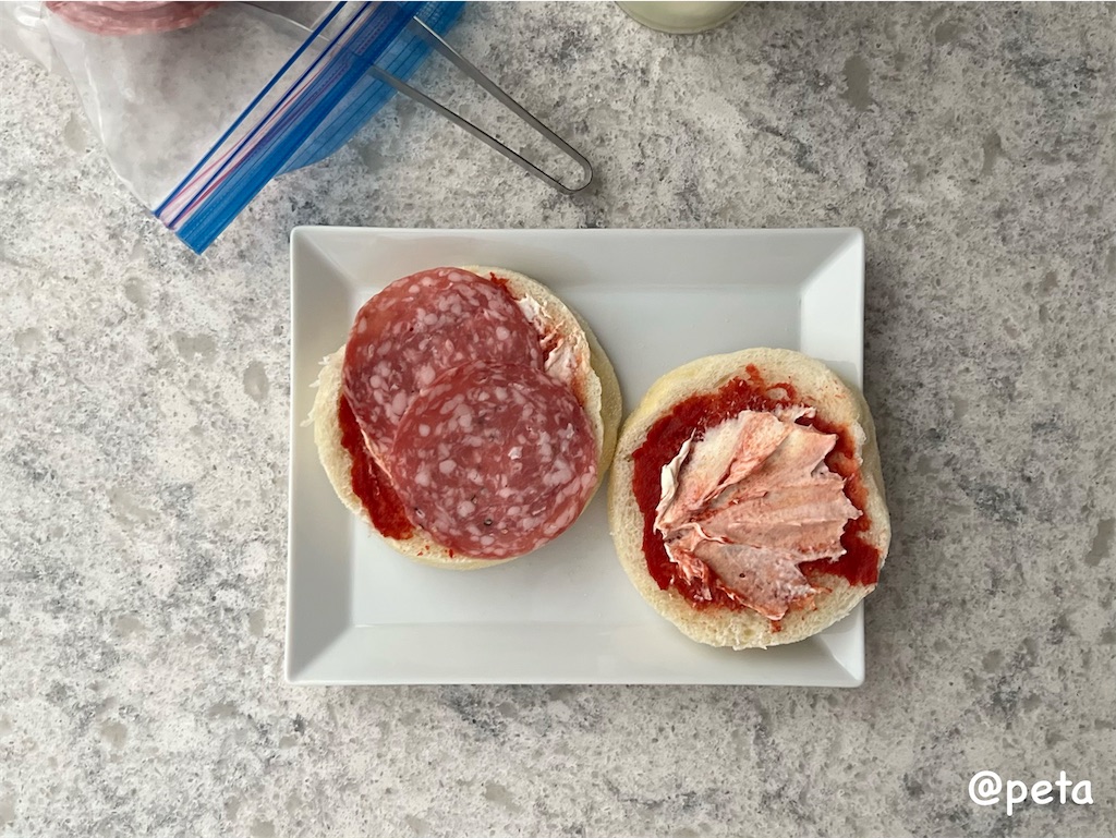 1.トマトペーストとサワークリームをパンに塗る。