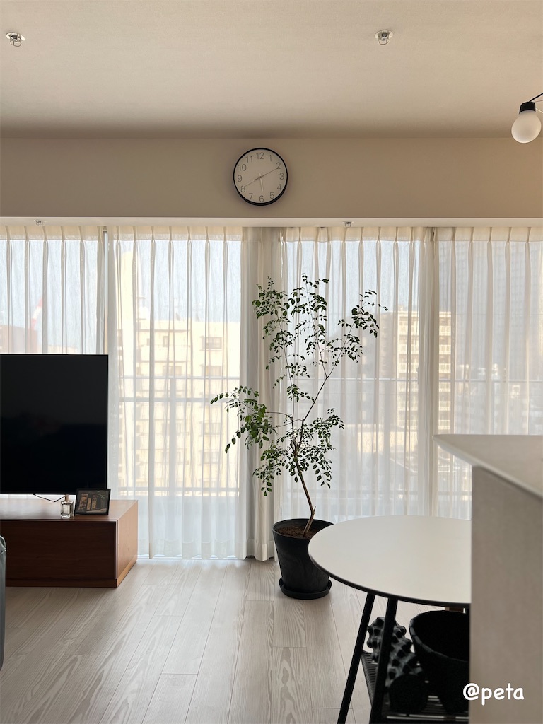 回転させて陽に向けようと思うとカーテンに触れてしまう・・かと言ってダイニング側に突き出すと夫がぶつかってしまう--