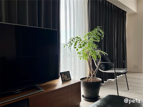 日中にカーテンを閉めて部屋の雰囲気を暗くしつつ、シマトネリコに陽を当てて撮影してみました。