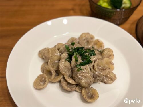 マッシュルームのクリームソース、コストコのマリナーラソースを使ってオレキエッテを作ってみました。