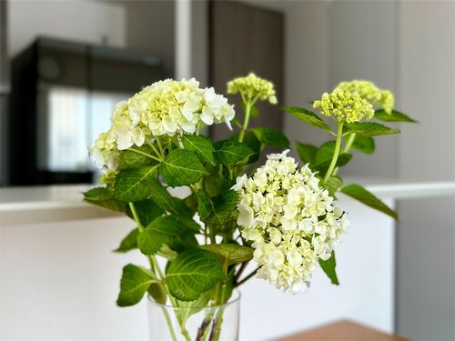 ダイニングと洗面に色違いのあじさいを飾ってみました。